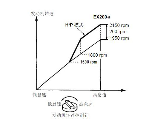 當(dāng)發(fā)動(dòng)機(jī)需要較大的功率時(shí),這種模式可以自動(dòng)增加發(fā)動(dòng)機(jī)的轉(zhuǎn)速和功率。也就是說,當(dāng)挖掘機(jī)在重負(fù)荷工作時(shí),動(dòng)臂伸出或斗桿收回時(shí)適合采用這種工作模式。